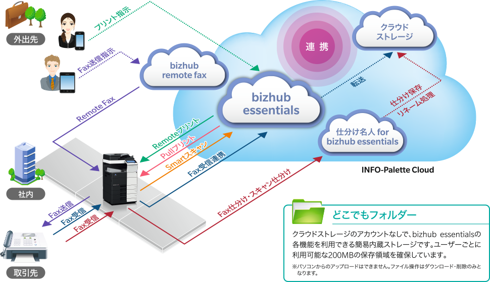 bizhub essentials is a service that links multifunction devices (bizhub) with cloud storage to provide new ways of using them. It facilitates information sharing between multifunction devices, PCs in the office and mobile devices when you are out and about. It allows you to build a new way of working by significantly improving efficiency regardless of location or device.